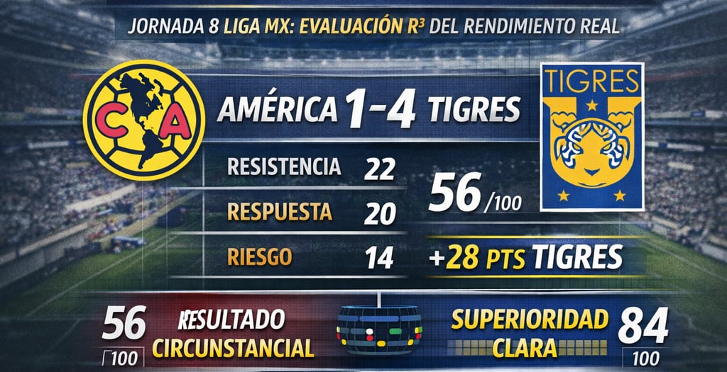 El América 1–4 Tigres de la Jornada 8 de Liga MX no fue una anomalía estadística. El Índice R³ confirma una brecha estructural significativa.