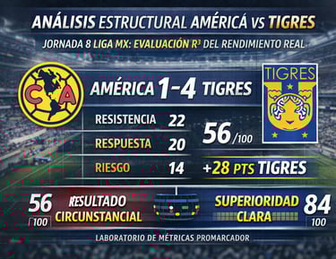 Análisis estructural América vs Tigres Jornada 8 Liga MX: evaluación R³ del rendimiento real.