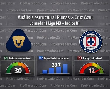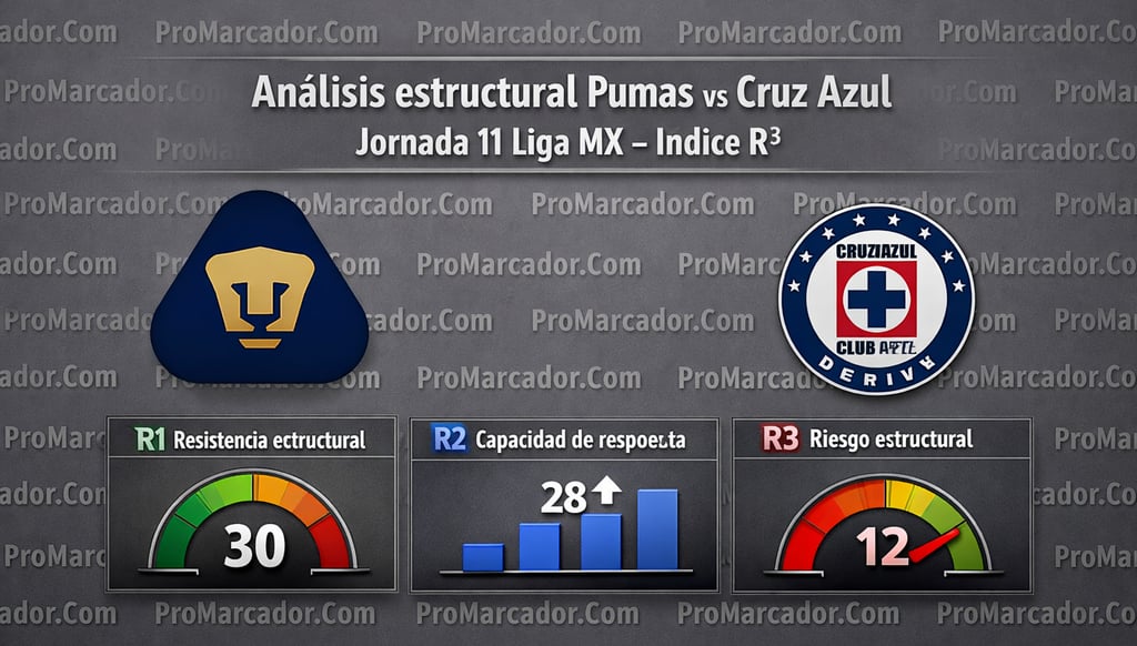 Quienes buscan un análisis estructural Pumas vs Cruz Azul Jornada 11 Liga MX encontrarán en este estudio una evaluación basada en el Sistema Índice R³, modelo desarrollado para medir la estabilidad competitiva real de un partido de fútbol. Este sistema analiza tres dimensiones fundamentales: Resistencia estructural (R¹), Capacidad de respuesta (R²) y Riesgo estructural (R³).