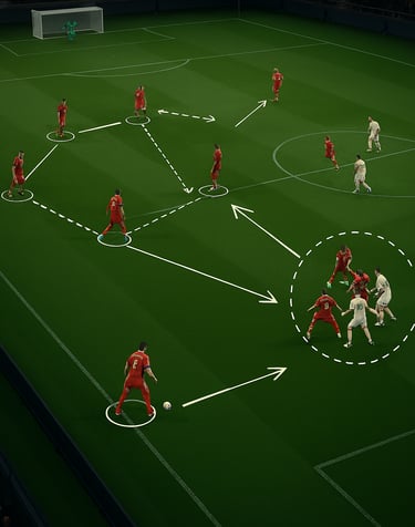 En defensa, los patrones son igual de reveladores. Un bloque que bascula al unísono hacia el lado del balón indica un mecanismo de control del espacio lateral. Si el equipo adelanta la línea defensiva tras pérdida inmediata, están ejecutando un patrón de presión tras pérdida con intención de recuperación agresiva. En contraste, si retroceden a un bloque medio, priorizan cerrar líneas de pase antes que disputar el balón.