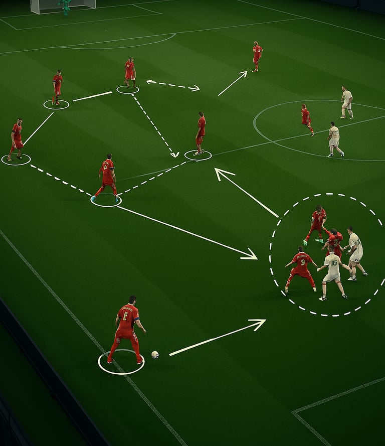 Otro patrón común surge en fase ofensiva: el movimiento diagonal del extremo hacia dentro para arrastrar la marca central. Esto libera el pasillo exterior para la proyección del lateral, generando superioridad numérica en banda. Si observas que el delantero retrocede entre líneas mientras los interiores atacan espacios, estás frente a un patrón diseñado para fijar centrales y activar rupturas profundas.