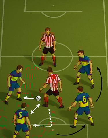 El primer bloque suele centrarse en la construcción baja, utilizando el clásico trabajo 3+1. Se forma un triángulo de salida (dos centrales y un mediocentro que se incrusta) mientras los laterales se posicionan en altura media. La microtarea consiste en repetir secuencias de giro, pase vertical y descarga hacia el tercer hombre. El objetivo no es solo ejecutar, sino activar patrones de lectura: identificar cuándo atraer, cuándo soltar y cuándo girar hacia el lado débil.