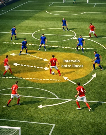 Los intervalos entre líneas son los espacios que se generan entre las líneas defensivas del rival, principalmente entre defensa y mediocampo, y entre mediocampo y ataque. No se trata de espacios amplios o evidentes, sino de zonas dinámicas que aparecen y desaparecen según el movimiento del balón, la orientación corporal de los defensores y la sincronización ofensiva. En estas zonas se decide gran parte de la ventaja posicional.